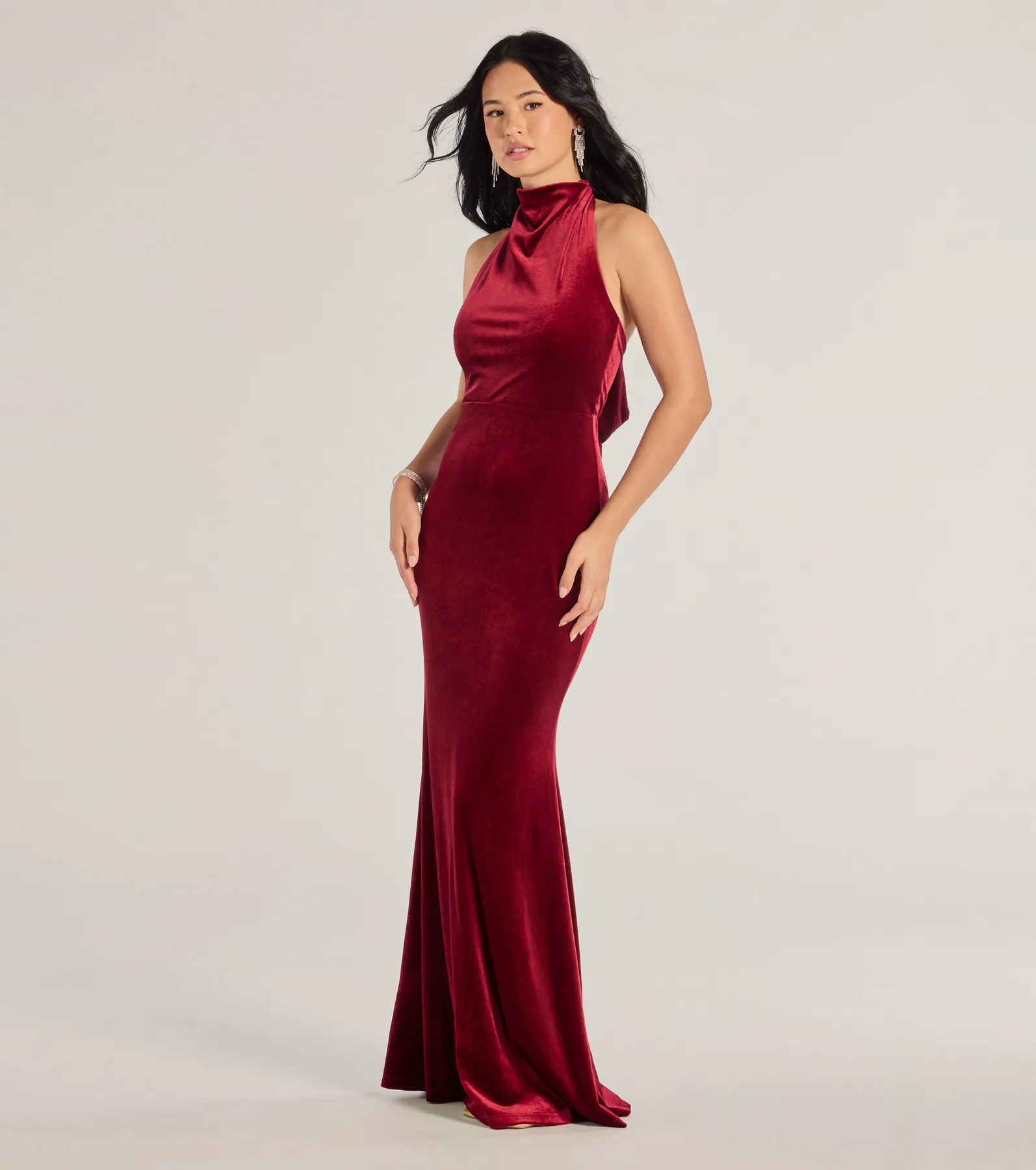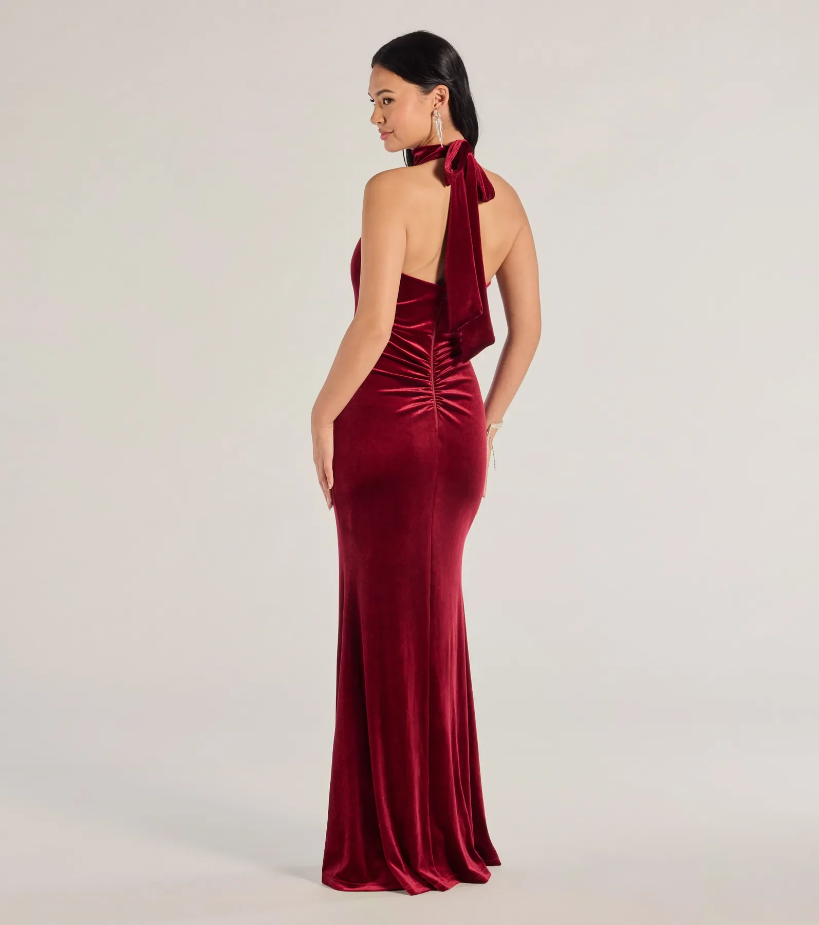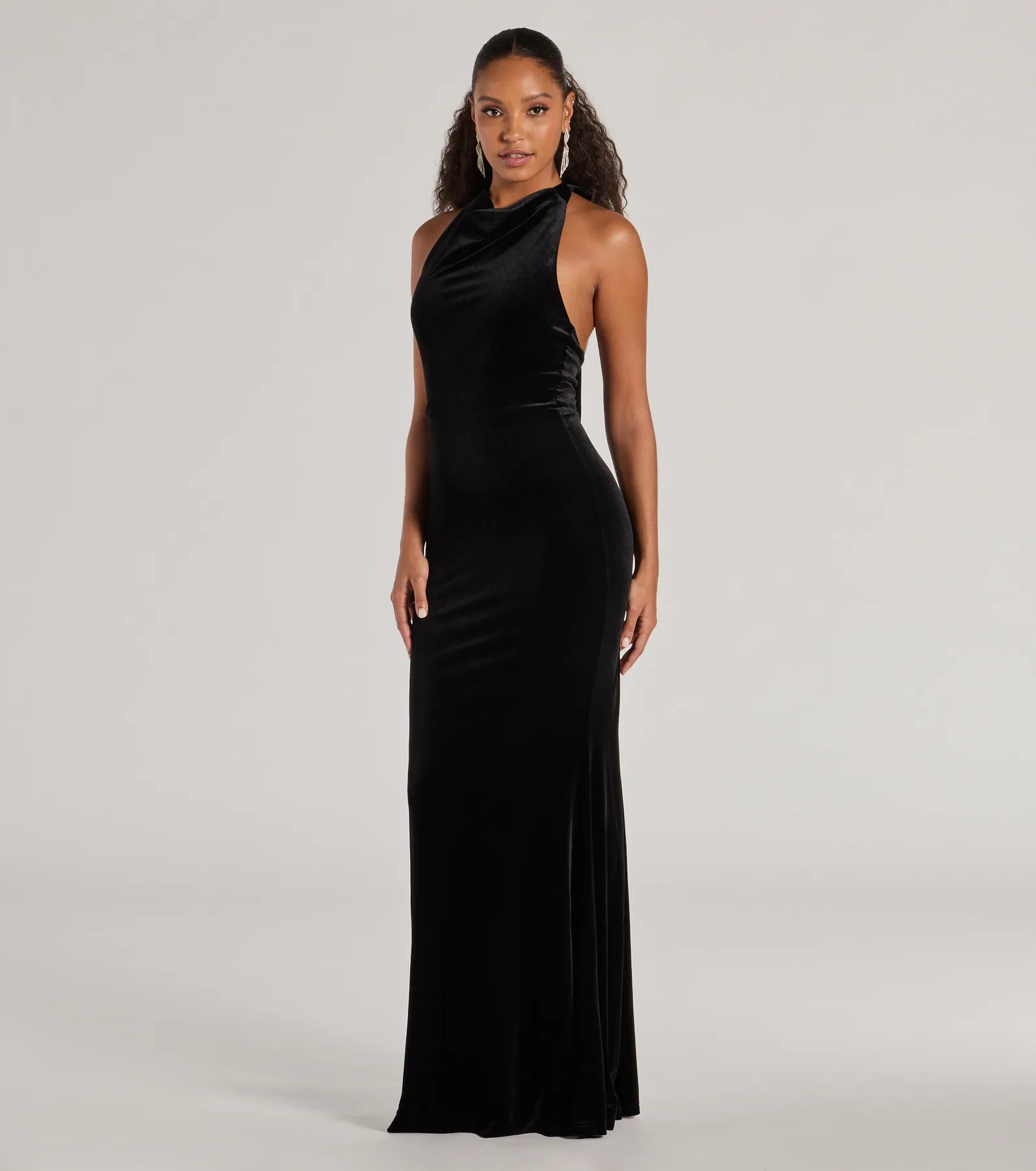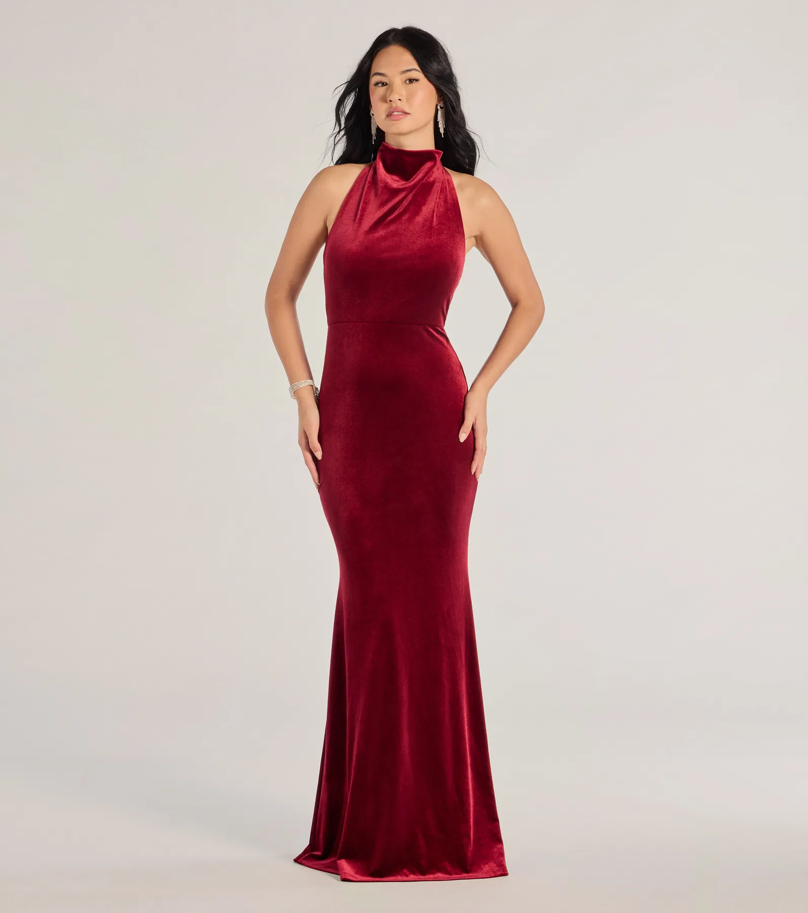 Make a mesmerizing impression in a long velvet dress that features a chic ruched halter neckline. halter neck ties. and a mermaid silhouette. Complete formal outfit with a sleek rhinestone clutch.�