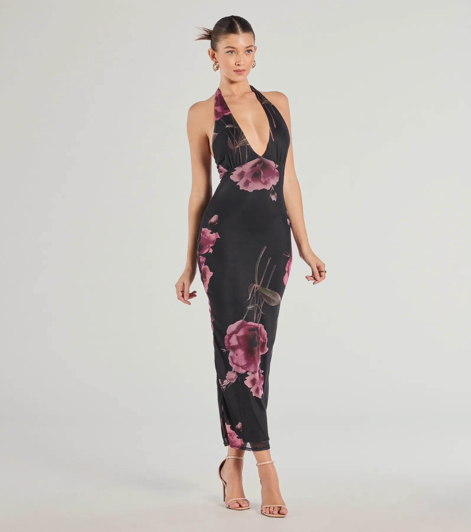 The maxi dress features a sleeveless halter neckline with halter neck ties. a large floral print. and a maxi-length hem. Complete the outfit with door knocker hoops for the perfect date outfit.