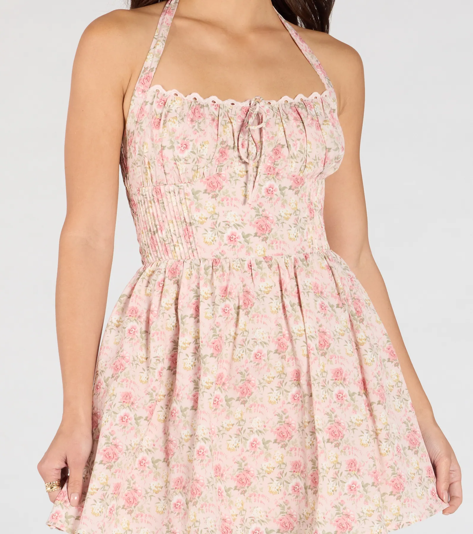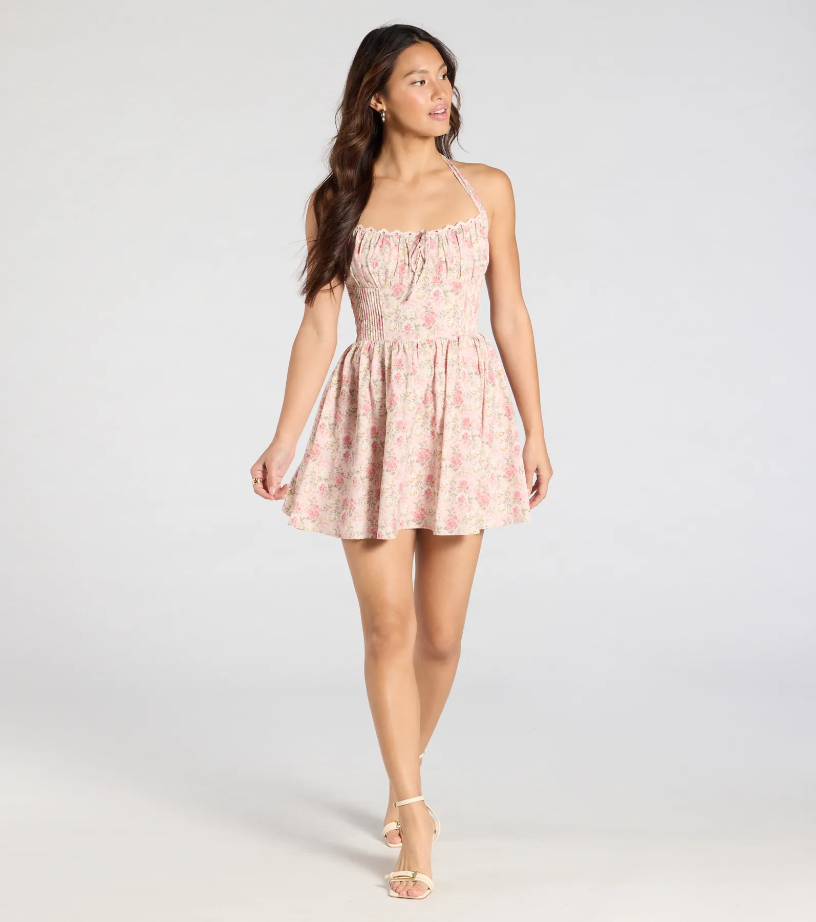 Twirl through the day in this floral skater dress boasting a lace trim halter neckline for added romance and a flirty mini-length hem to show off your shoes.