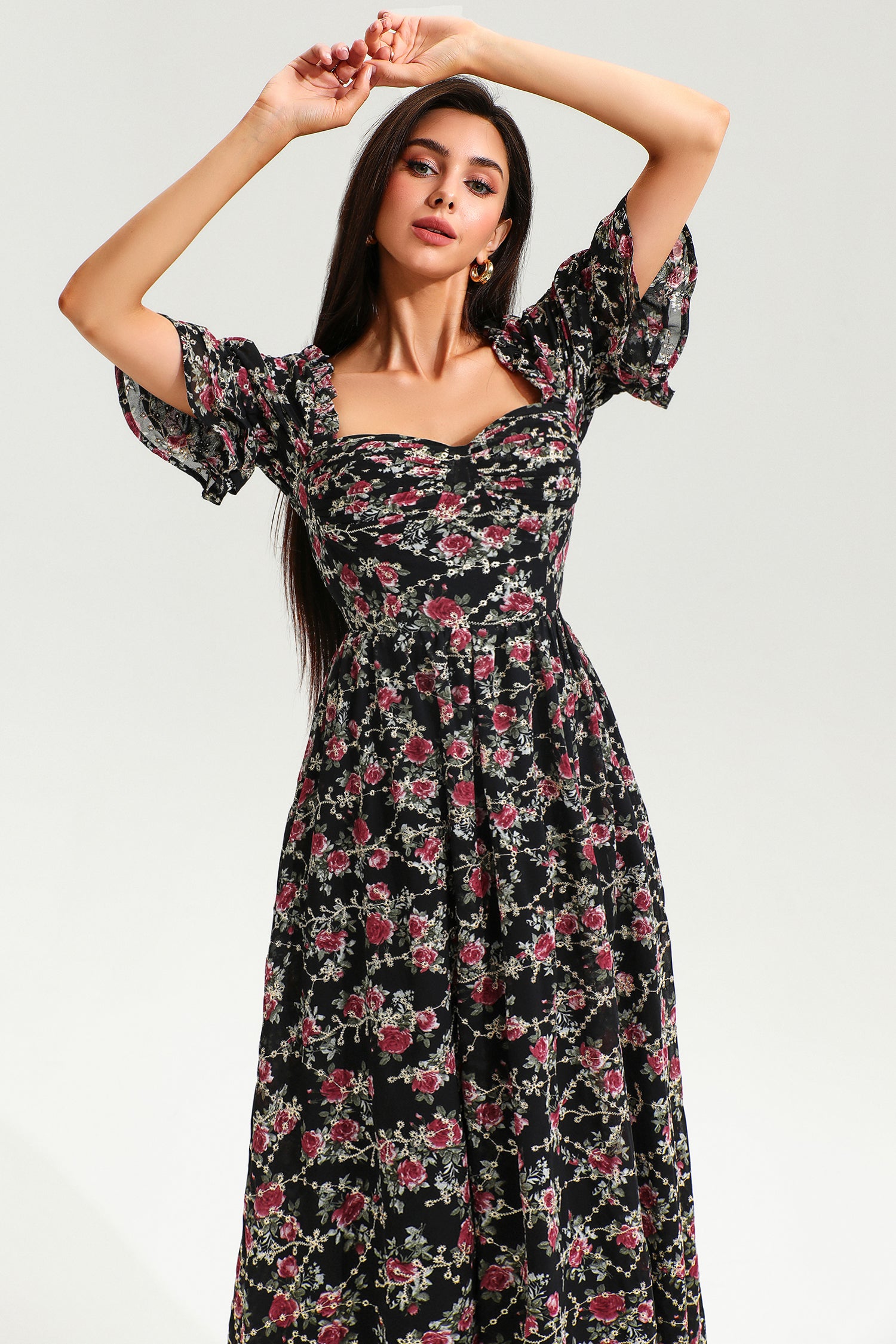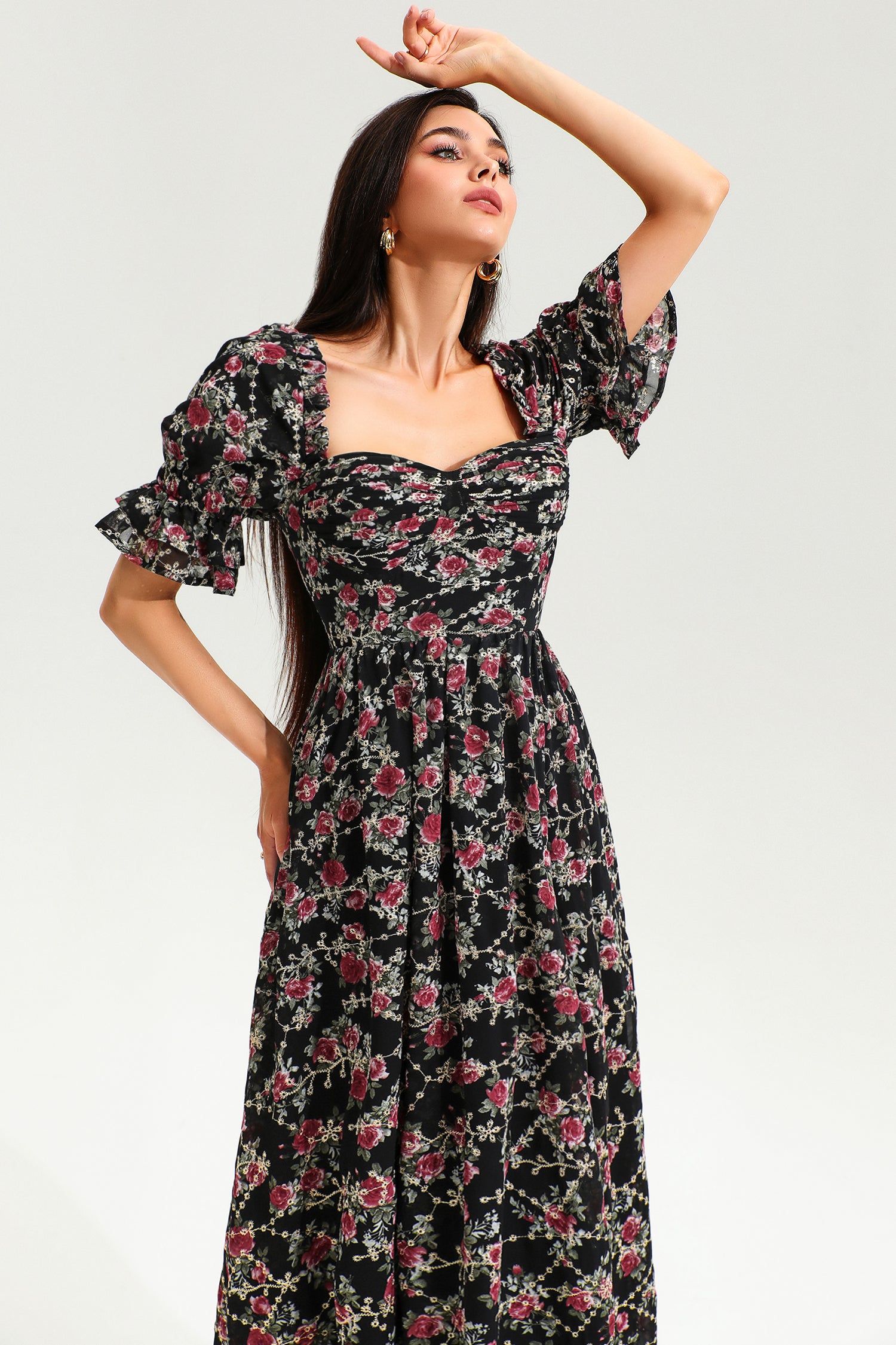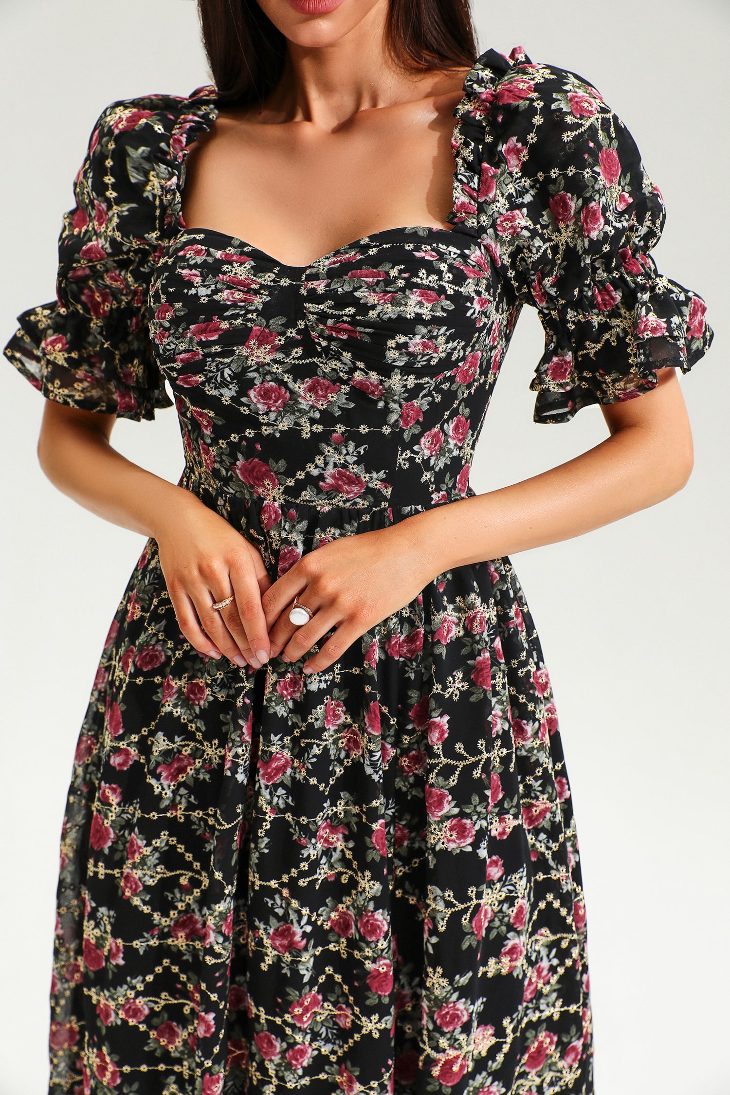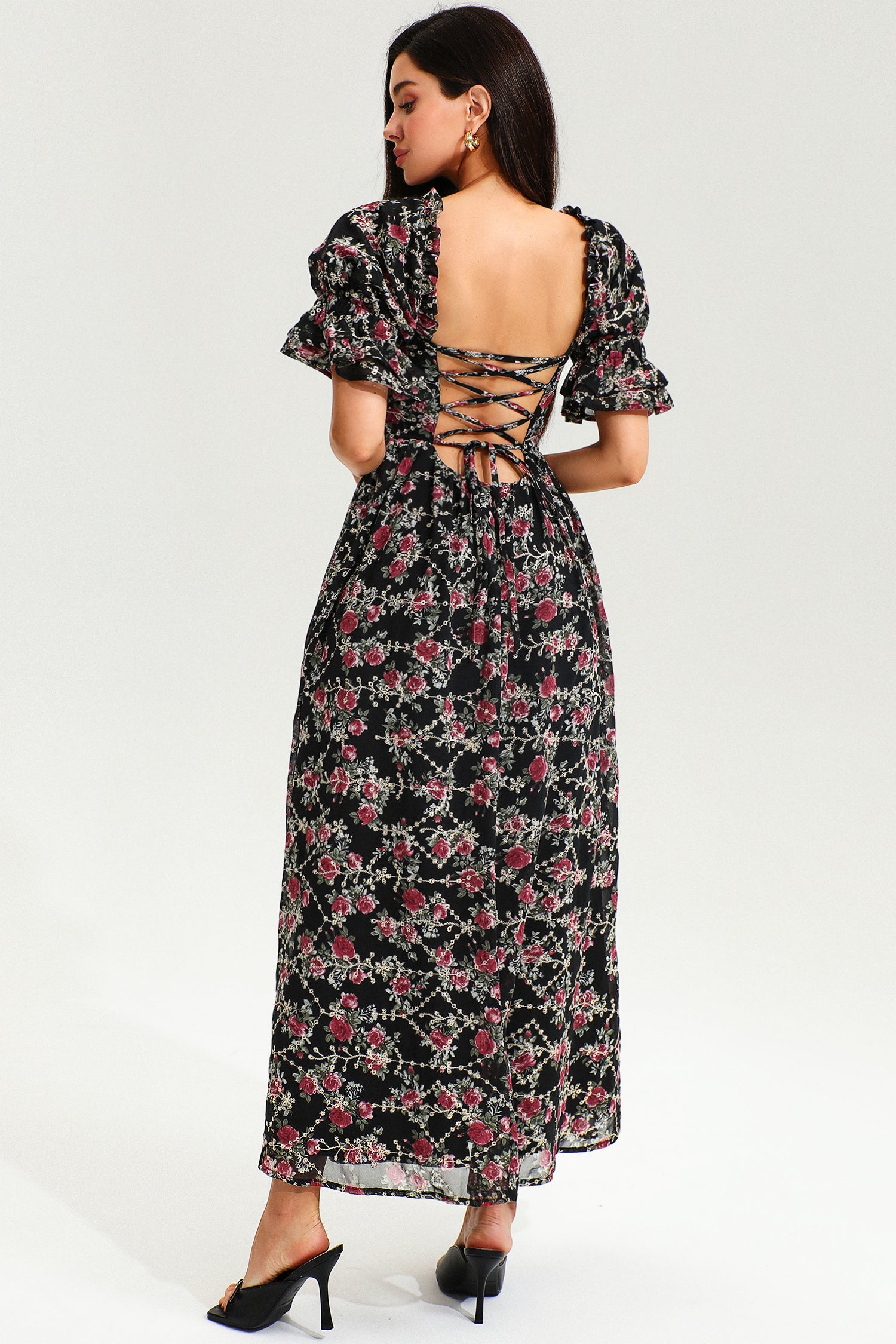 Floral Puff Sleeve Corset Backless Lace Up Slit Midi Dress Black
