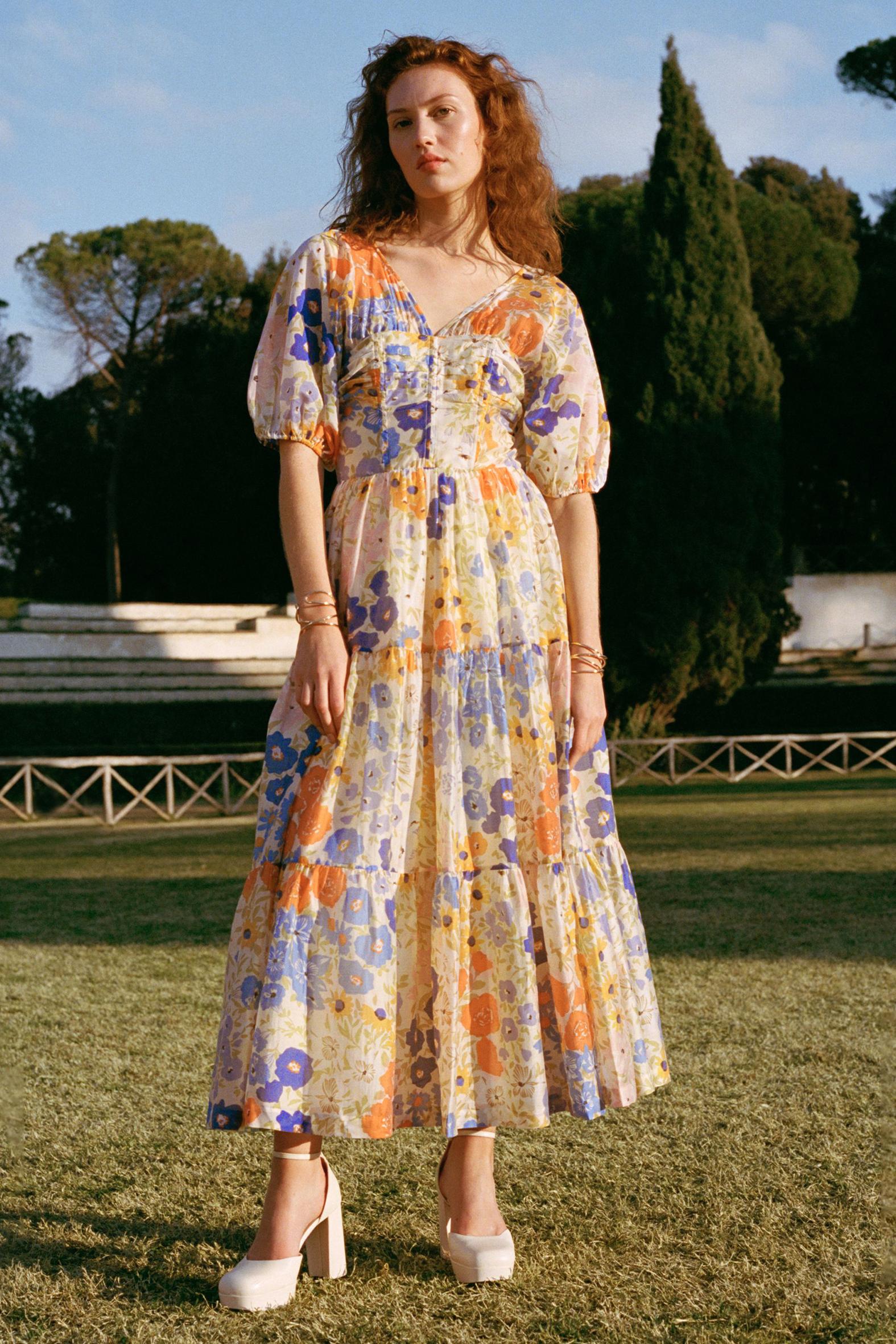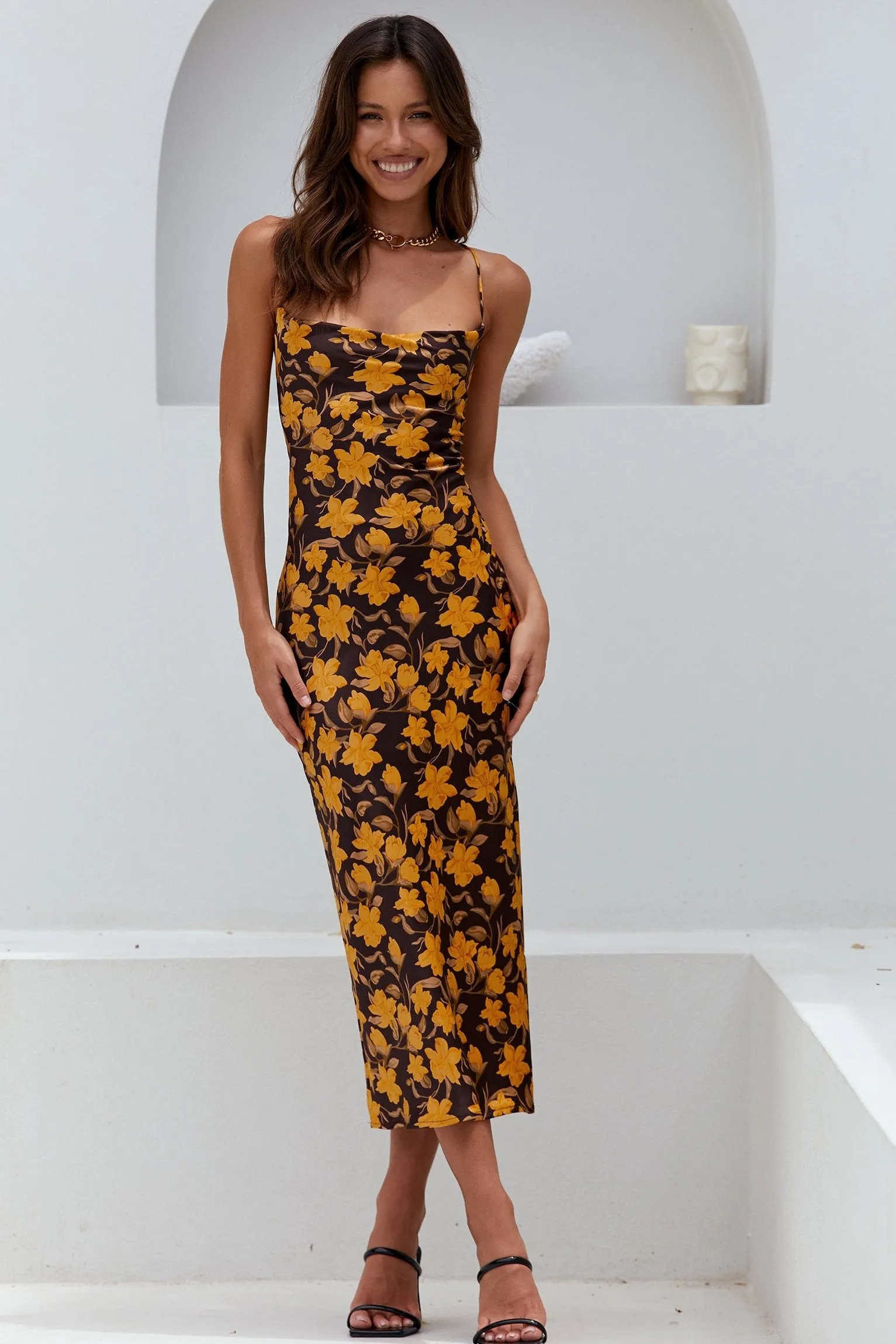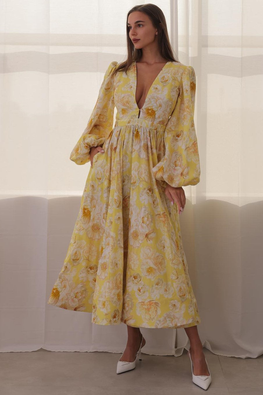 Floral V-Neck Short Sleeve Midi Dress Yellow