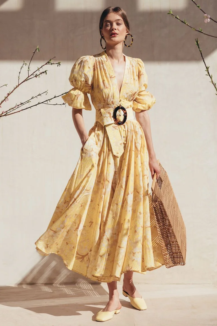 Puff Sleeve Bow Knot Midi Dress Yellow