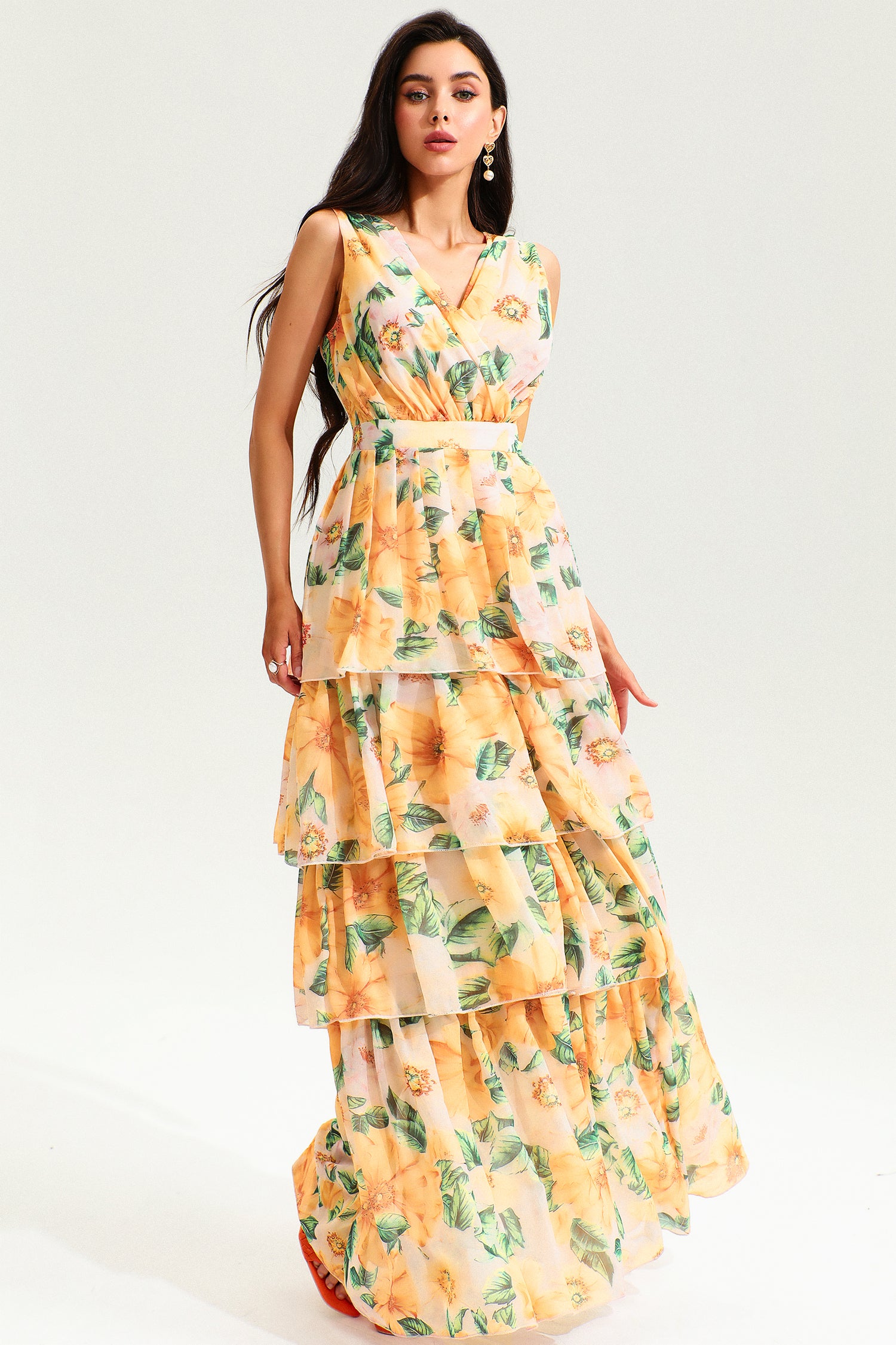 V-Neck Sleeveless Floral Frill Maxi Dress