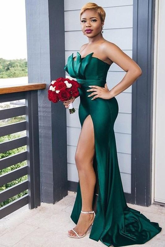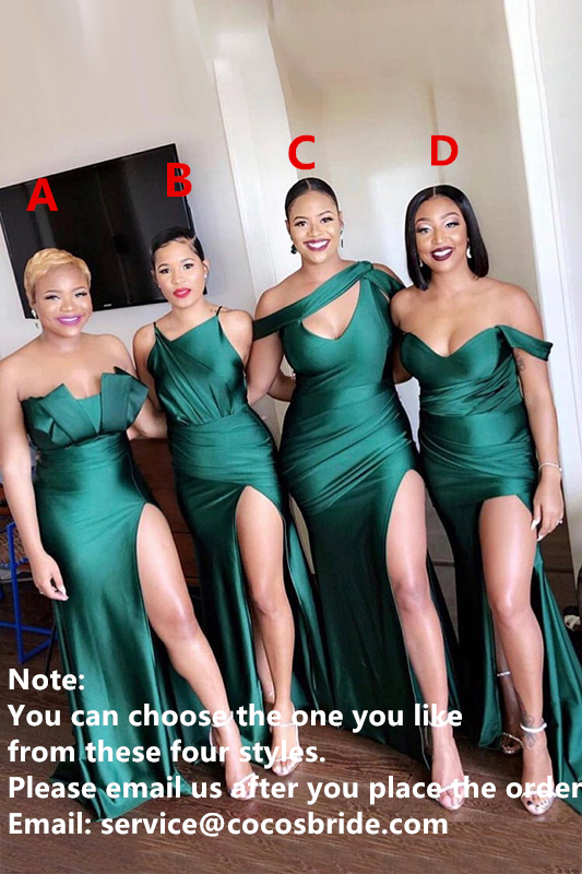Elegant dark green long mermaid bridesmaid dresses with a flattering side split, offered in mixed styles for a cohesive yet personalized bridal party look. Crafted for sophistication, these gowns ensure comfort and effortless grace at every special occasion.